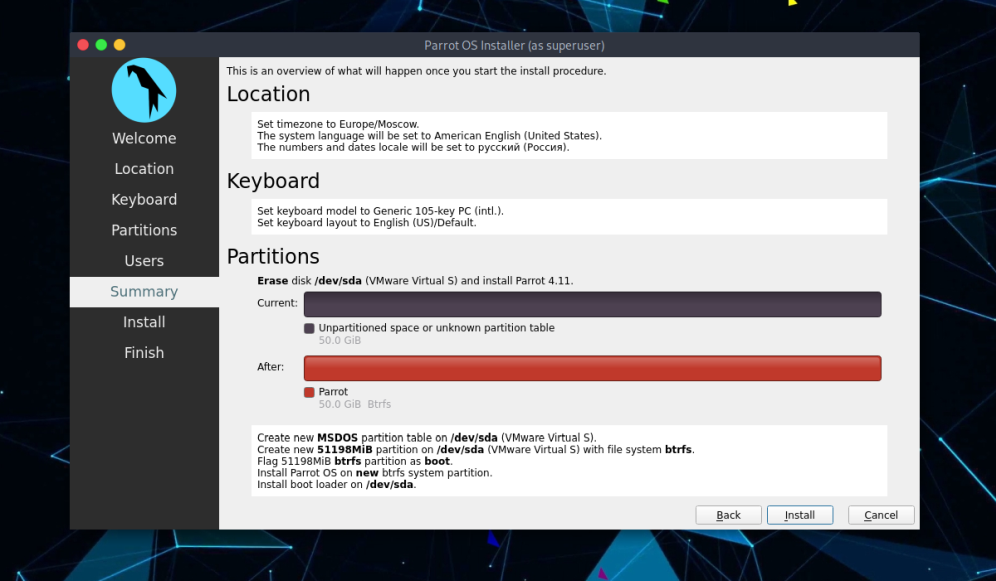 На данном этапе установщик отобразит все ранее заданные настройки. Нажмите на кнопку Install для начала установки операционной системы.