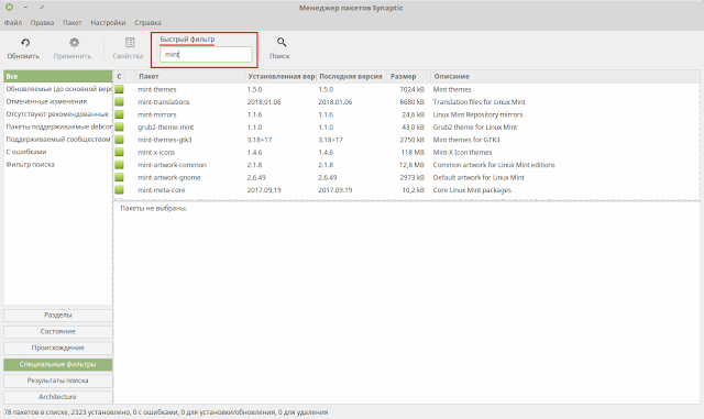 Несмотря на то, что функция Поиск присутствует в Synaptic, Поле «Быстрый фильтр» осуществляет более быстрый поиск пакетов сразу после ввода пользователем названия искомого пакета.