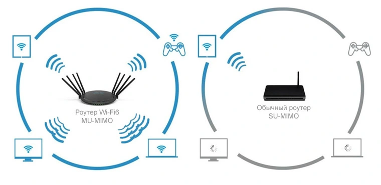 Wi-Fi 6 поддерживает до 8 каналов MU-MIMO (Multipule User, Multiple Input, Multiple Output — Несколько пользователей, Множественный ввод-вывод). Это значит, что максимальная скорость роутера может быть распределена по нескольким клиентам в нужных пропорциях.