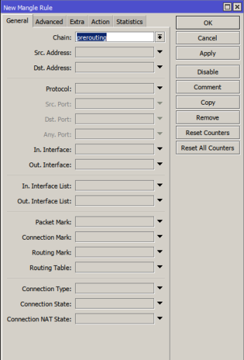 1. Заходим в IP — Firefall — Mangle и создаём новое правило. На вкладке General устанавливаем Chain — prerouting: