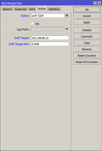 [admin@Mikrotik] /ip firewall mangle add action=sniff-tzsp chain=prerouting sniff-target=192.168.88.10 sniff-target-port=37008