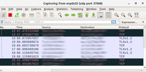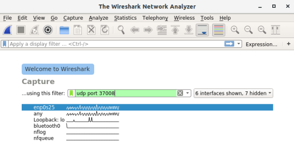 2. На хосте запускаем WireShark. Указываем фильтр udp port 37008 и выбираем интерфейс, на котором висит ip, указанный в качестве Sniff Target.