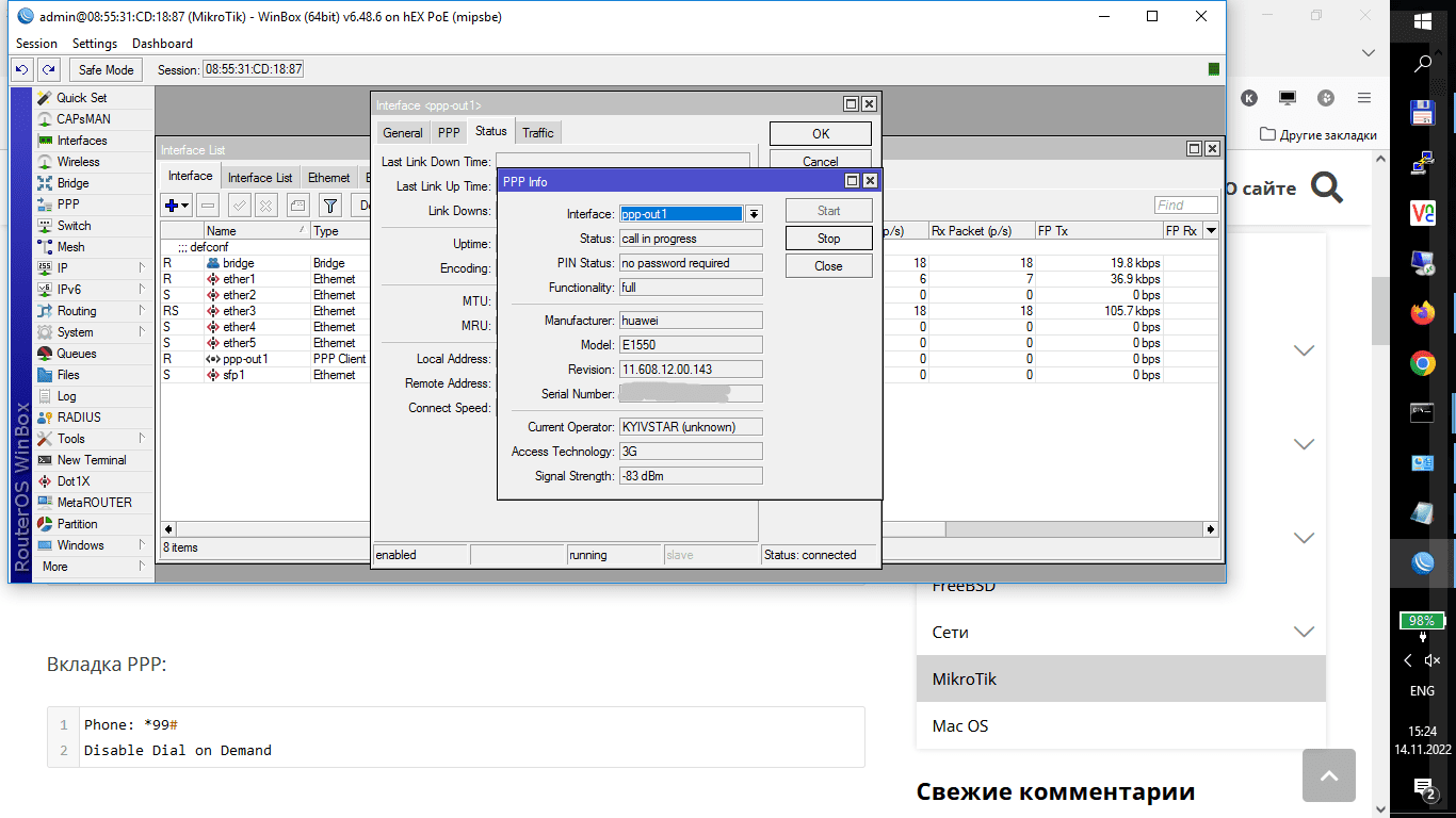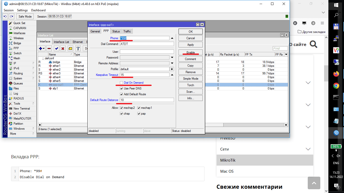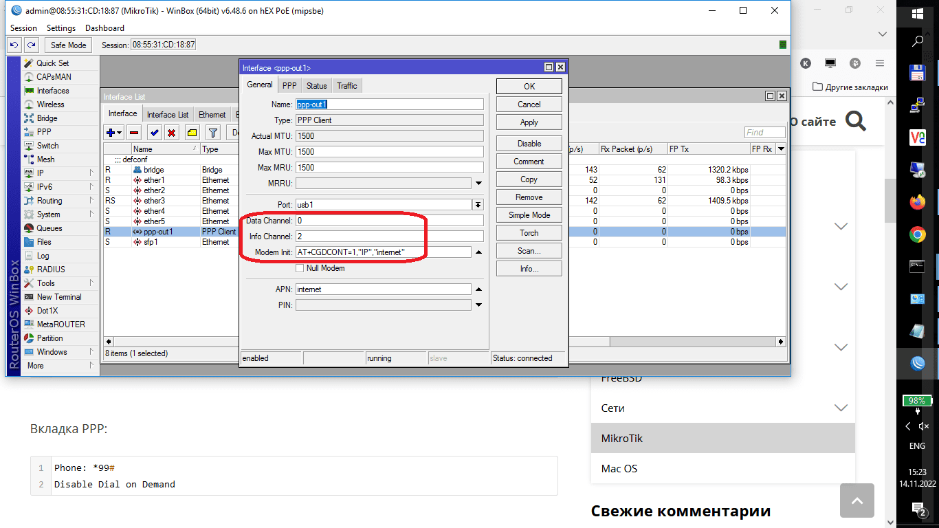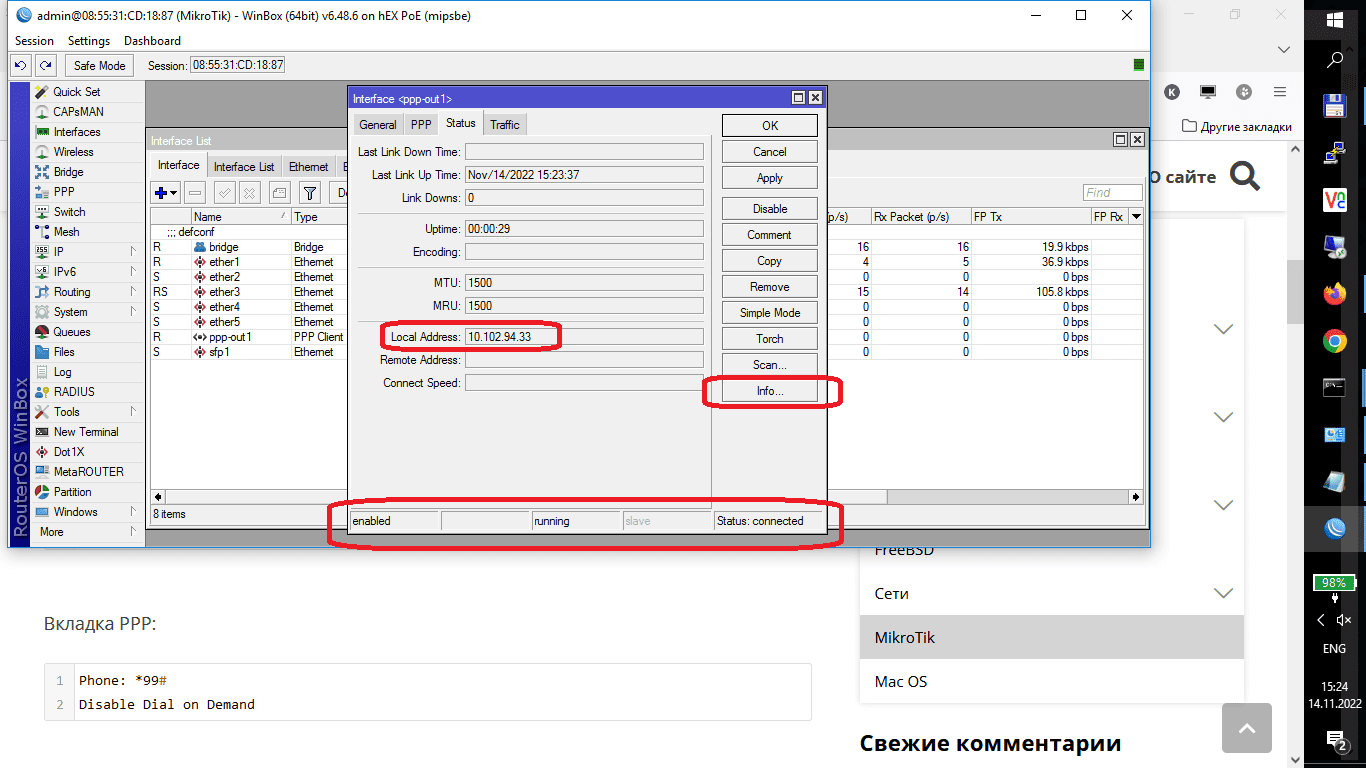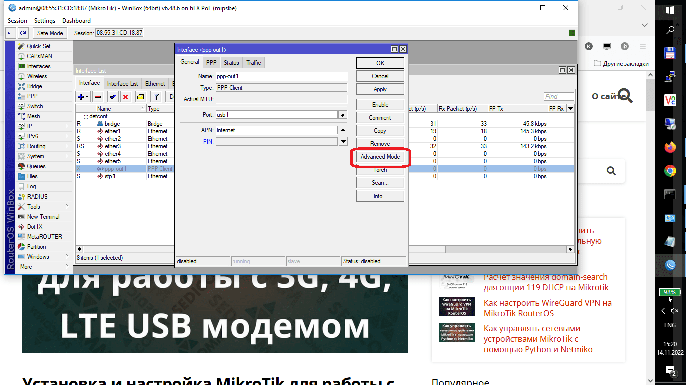 Установим SIM-карту в модем, модем — в USB-порт маршрутизатора Mikrotik и ждем 15 секунд, далее смотрим в список интерфейсов он должен появиться как ppp-out1.