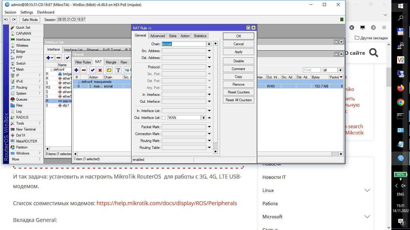 Сегодня расскажем, как настроить резервное интернет-соединение при помощи подключения 3G, 4G, LTE USB-модема к сетевому оборудованию MikroTik. Так же дополнительно настроим автоматическое переключение на резервный канал. В таком случае высокий приоритет будет у Интернета от провайдера, но при его отсутствии система автоматически переключится на 3G, 4G, LTE USB-модем, имеющий более низкий приоритет. Эта инструкция подойдет для всех устройств MikroTik которые обладают USB портом. И так задача номер один установить и настроить MikroTik RouterOS для работы с 3G, 4G, LTE USB-модемом.