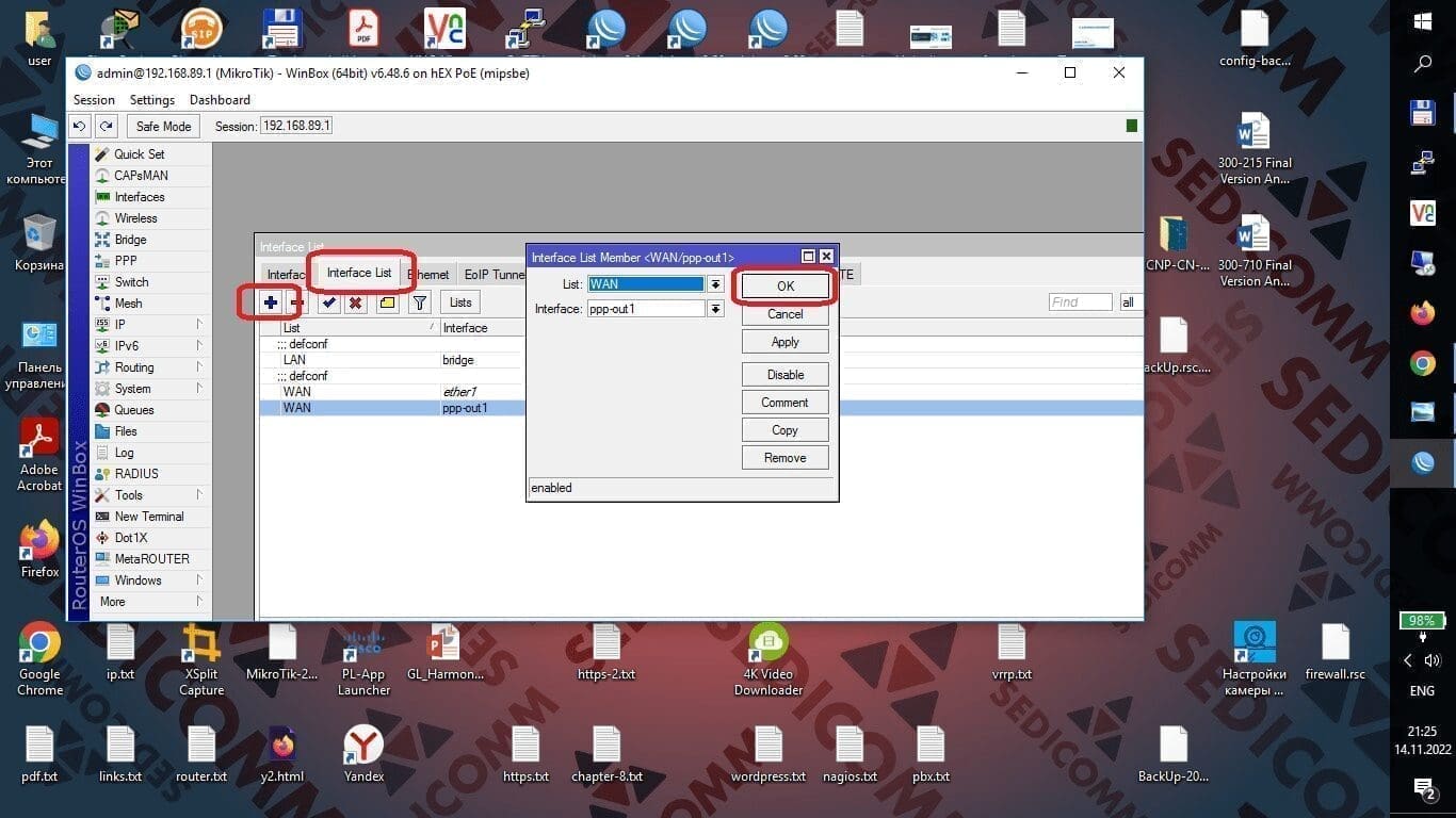Требуется выходной интерфейс ppp-out1 внести в список WAN-интерфейсов. Для этого идем в Interfaces, вкладка Interface List, нажимаем на + и добавляем WAN — ppp-out1.