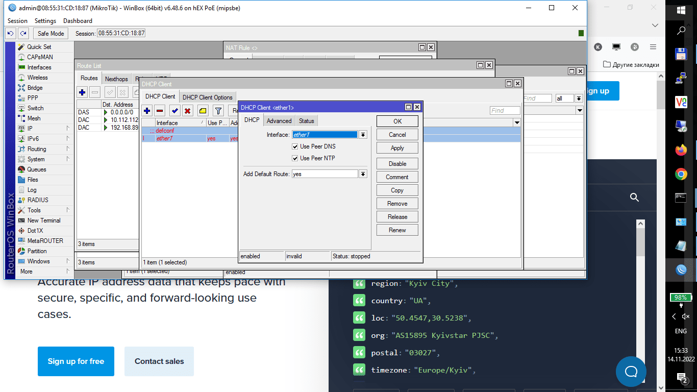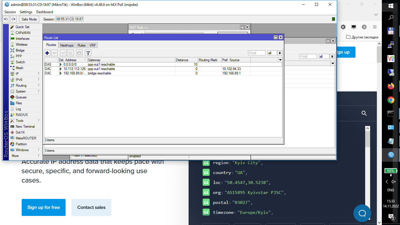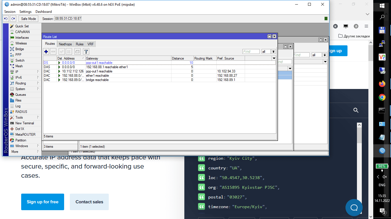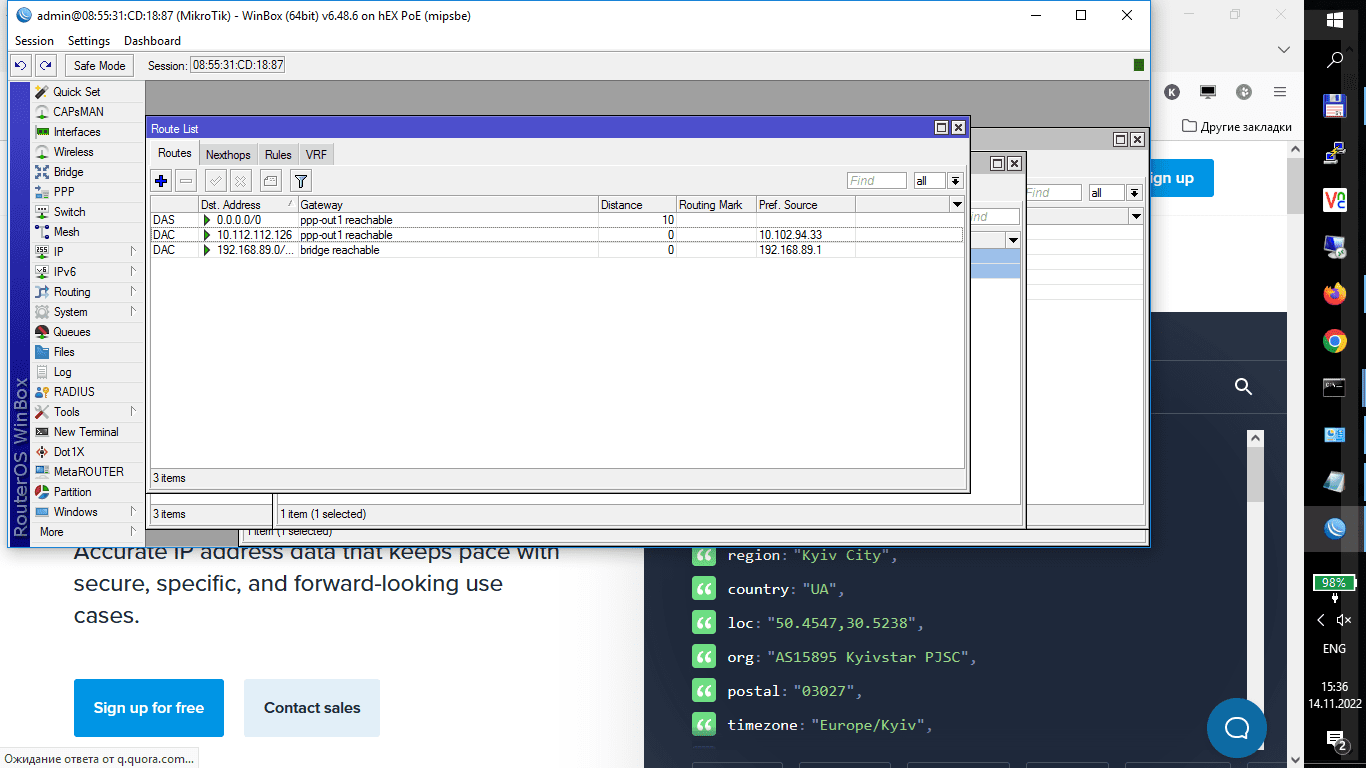 Подключаем проводного провайдера, смотрим таблицу маршрутизации Ip —> Routes: