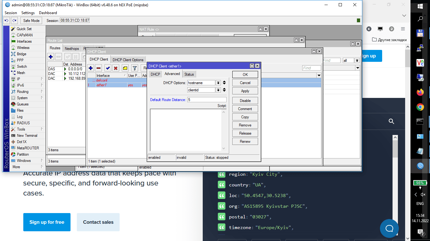 Мы видим основой маршрут в Интернет через интерфейс ppp-out1 с административным расстоянием 10. Далее подправим настройки DHCP-клиента, для этого идем в Ip —> DHCP Client.