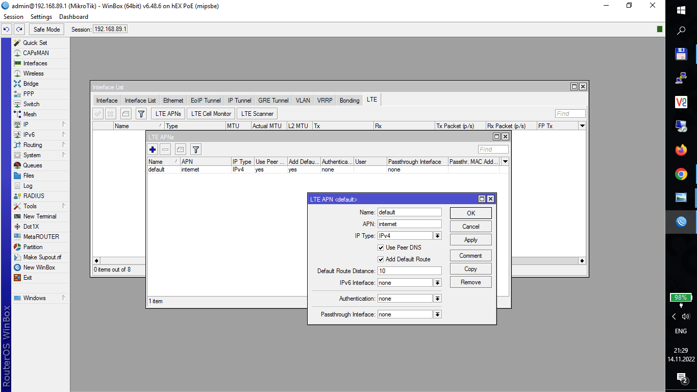 Дополнительные настройки APN (идентификатор сети пакетной передачи данных) находятся в Interfaces -> вкладка LTE —> кнопка LTE APNs, приведу на всякий случай.