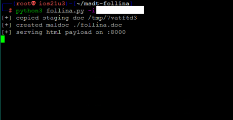 Теперь на следующем снимке экрана мы видим, что наш вредоносный doc-файл создан и запускает приемник для своей HTML полезной нагрузки на порту 8000.