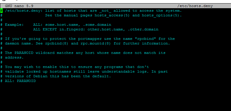 Зайдите на ваш удалённый сервер и откройте файл hosts.deny с помощью текстового редактора.
