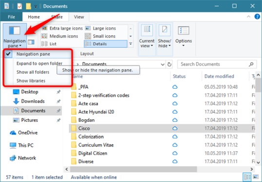 Одним из наиболее полезных инструментов в проводнике является панель навигации, которая всегда отображается слева. Он предлагает самый простой и быстрый способ просмотра ваших файлов. Однако не все люди хотят его использовать, и некоторые пользователи старой школы, которые также видели старый Windows Explorer из Windows XP, могут захотеть его скрыть. Для этого перейдите на вкладку «Вид» на ленте и перейдите в раздел «Панели» на панели инструментов ленты. Нажмите или коснитесь панели навигации, а затем отмените выбор параметра «Панель навигации», чтобы скрыть панель навигации от просмотра. Чтобы вернуть панель навигации обратно, выполните то же действие.