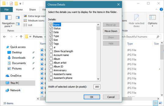 В этом списке отображаются только наиболее часто используемые столбцы, но есть из множества других, которые могут отображать любой тег метаданных, поддерживаемый Windows. Нажмите или коснитесь «Выбрать столбцы…» внизу списка, чтобы открыть диалоговое окно, содержащее все эти параметры. В этом диалоговом окне вы также можете изменить ширину по умолчанию, при которой отображаются столбцы.