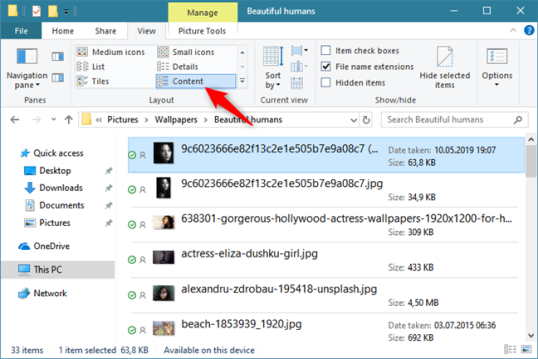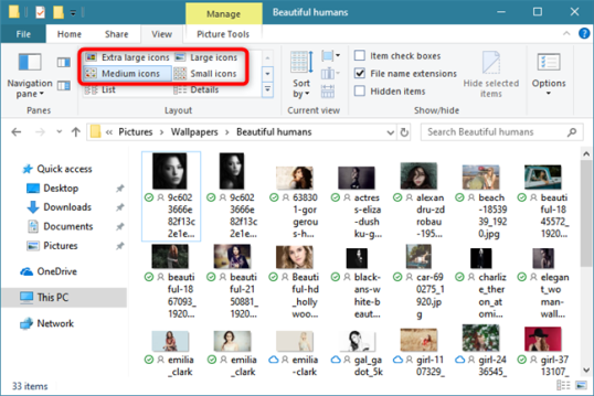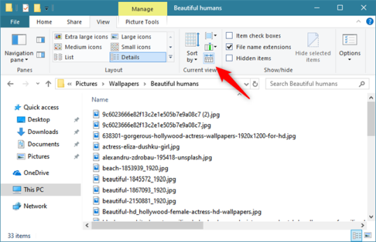 Некоторые люди любят значки, некоторые любят плитки, а некоторые предпочитают видеть подробности о своих файлах. Проводник позволяет вам смотреть на ваши файлы так, как вы хотите. Все, что вам нужно сделать, это выбрать способ, которым вы предпочитаете смотреть на них, в разделе «Макет» на вкладке «Вид». Выберите между большими, большими, средними или маленькими значками для отображения файлов и папок в виде значков переменного размера с именами файлов, показанными под ними. Наименьший параметр отображает только общие значки, в то время как любой из более крупных вариантов предоставляет миниатюры фотографий или видео, которые находятся в папке, которую вы просматриваете с помощью Проводника.