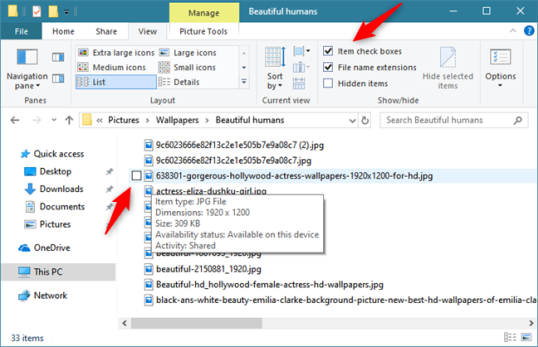Если вы используете сенсорный экран, самый простой способ выбрать такие элементы, как файлы или папки в проводнике, — это использовать флажки элементов. Включение «Флажки элемента» отображает флажок рядом с каждым файлом или папкой. На ноутбуке или настольном ПК вы можете видеть флажки, когда наводите курсор мыши на файл или папку, а на сенсорном экране рядом с каждым файлом отображаются поля. Вы также должны увидеть поле, отображаемое над списком файлов, которое позволяет вам выбрать все файлы в текущей папке одним нажатием или щелчком. Эта опция позволяет пользователям выбирать несколько файлов без необходимости удерживать дополнительные клавиши или щелкать и перетаскивать.