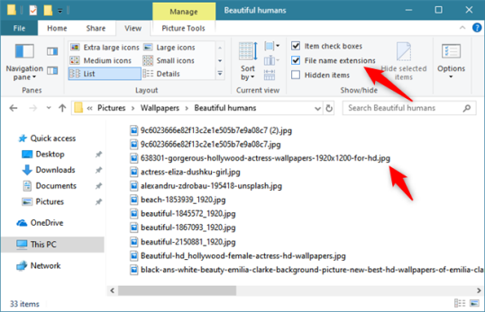 Если вы хотите точно увидеть, в каком формате находится каждый файл, включите «Расширения имен файлов» на вкладке «Вид», чтобы включить или отключить отображение расширений файлов в конце имен файлов.