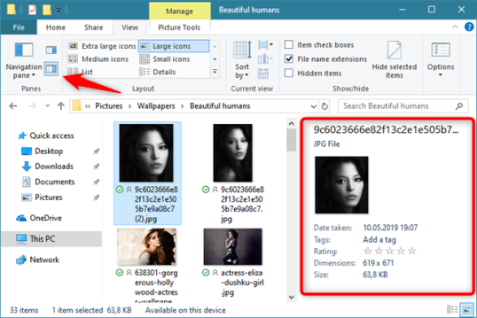 Хотя панель предварительного просмотра выглядит хорошо, она не отображает подробную информацию о выбранных файлах. Если это то, что вы хотели бы увидеть, нажмите или коснитесь кнопки панели «Сведения» на вкладке «Вид». Это создает панель, которая отображает предварительный просмотр выбранного файла вместе со всеми метаданными выбранного файла. Вы даже можете редактировать метаданные из этой панели, щелкая доступные поля данных и вводя новые значения.