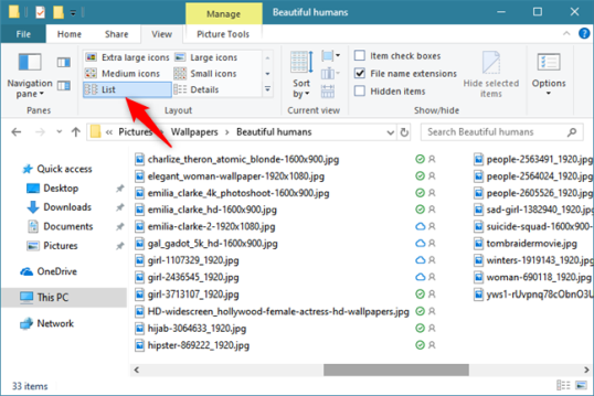 Опция Список предоставляет список файлов и папок с общим значком рядом с ним. Список упакован в несколько столбцов.