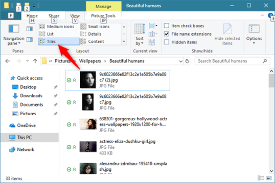 Если вы привыкли к плиткам, выберите Плитка. Это позволяет отображать значки в проводнике так же, как и при значке «Средний», но в правой части каждого значка отображается полное имя файла и тип файла.