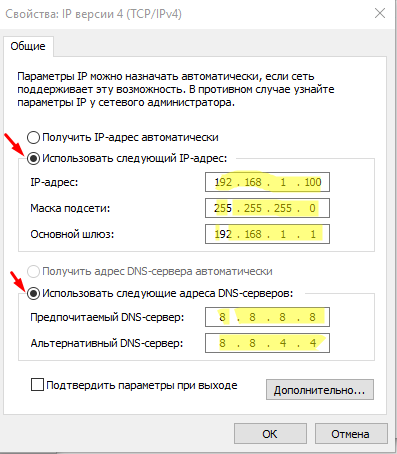 • IP – 192.168.1.100 – ваш IP, главное, чтобы не пересекался с другими, можно взять, например, 192.168.1.12, 192.168.1.13, 192.168.1.241.