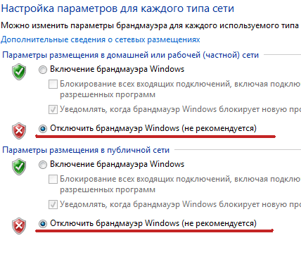 • Брандмауэр – отключить (вход через Панель управления – «Система Безопасности» -> «Брандмауэр Windows» – «Включение и отключение брандмауэра Windows»)
