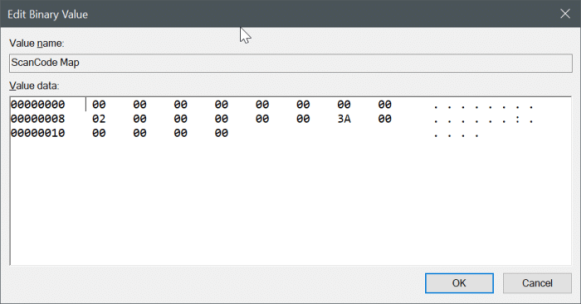 Шаг 4: Наконец, дважды щелкните на скан карте , чтобы изменить его двоичное значение по умолчанию. Добавьте следующее двоичное значение, чтобы отключить ключ CapsLock.