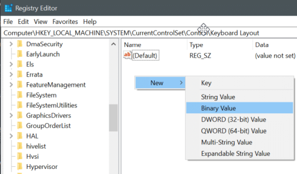Шаг 3: Выберите клавишу раскладки клавиатуры на левой панели. На правой стороне, щелкните правой кнопкой мыши на пустом месте, нажмите Создать, а затем щелкните двоичное значение. Назовите новое двоичное значение как ScanCode Map.