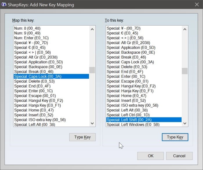 Затем нажмите кнопку Type key справа, а затем нажмите клавишу Shift или любую другую клавишу, на которую вы хотите переназначить клавишу CapsLock. Щелкните кнопку ОК.