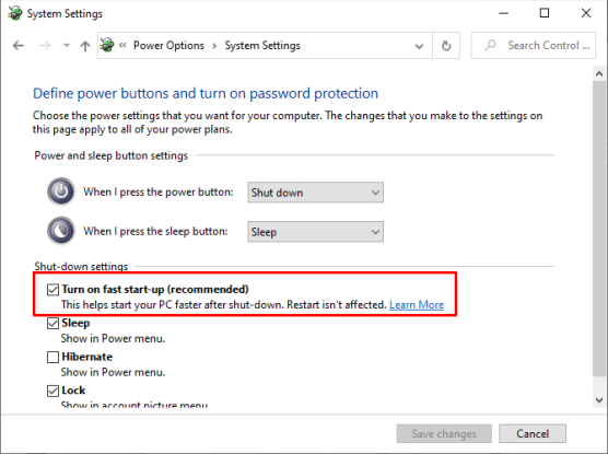 Когда откроется окно Панели управления, выберите Выбрать, что делают кнопки питания, затем Изменить настройки, которые в настоящее время недоступны. Установите флажок Включить быстрый запуск, чтобы убедиться, что он включен, затем выберите Сохранить изменения.