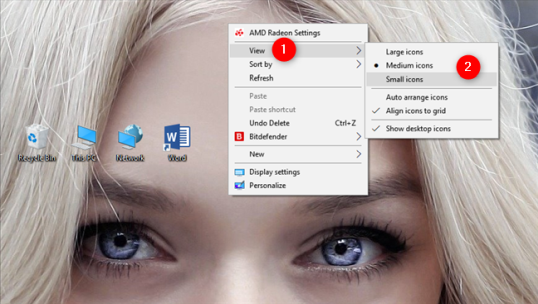 Сначала перейдите на рабочий стол и сверните или закройте все открытые приложения. Чтобы уменьшить значки на рабочем столе, нажмите и удерживайте клавишу Ctrl на клавиатуре и прокрутите колесо мыши вниз.