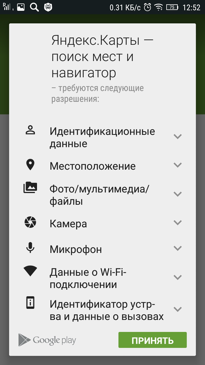 - Подтвердите, что разрешаете приложению использовать данные на вашем телефоне. Кликните по зелёной кнопке «Принять».