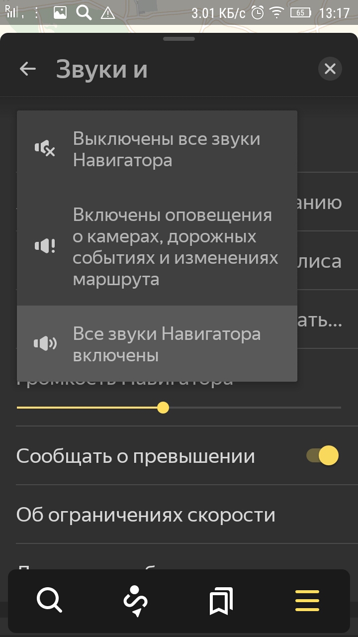 - Выберите один из вариантов: «Выключены все звуки навигатора», «Включены оповещения о камерах», «Все звуки включены».