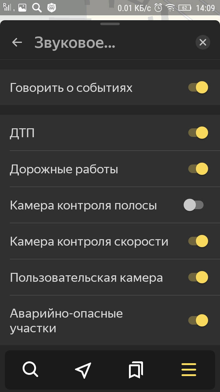- В разделе «Дорожные события» настройте уведомления о появлении камер на дорогах, приближении к опасным участкам, дорожных работах в определённых местах, авариях. Чтобы выключить полностью все сообщения подобного рода, кликните по переключателю справа от пункта «Говорить о событиях».