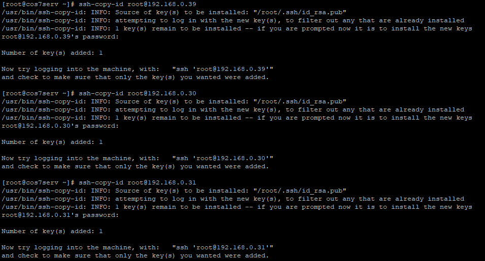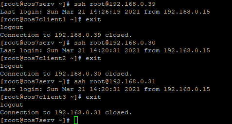 Проверяем вход пользователя root по SSH-ключам c сервера на узлы.