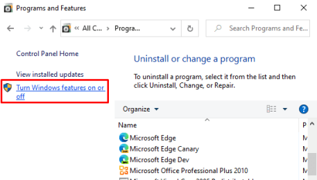 В левой боковой панели есть ссылка «Включение или отключение функций Windows», нажмите на нее.