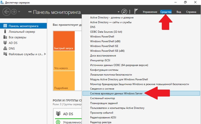 После установки компонента в диспетчере серверов в выпадающем меню пункта «Средства» выбираем строчку «Система архивации данных Windows Server».