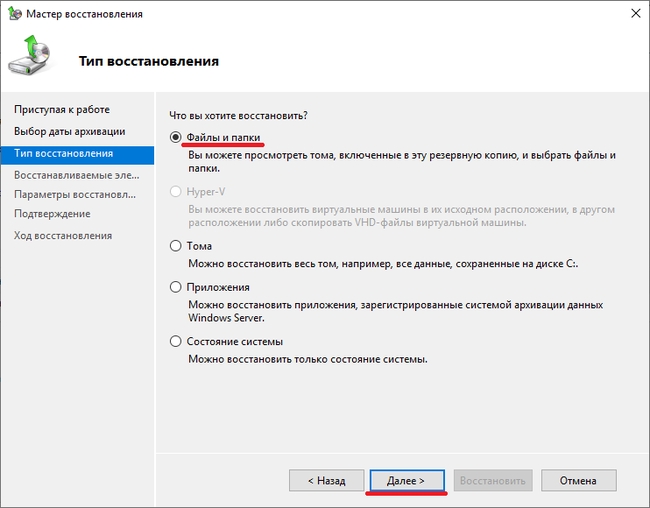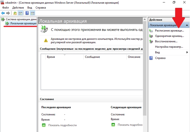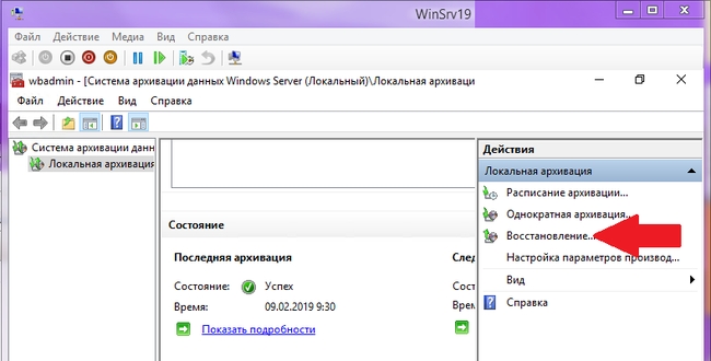 Восстановим систему из созданной копии. Это можно сделать из основного окна системы архивации Windows Server, нажав на строчку «Восстановление».