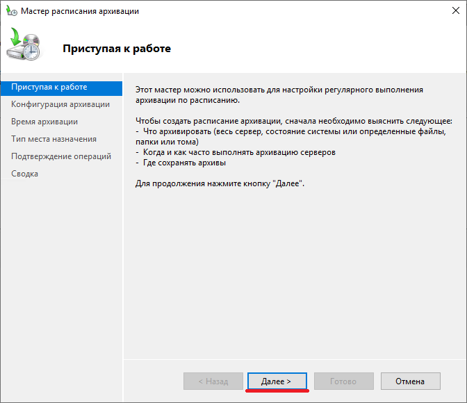 Запускаем систему архивации данных Windows Server, в разделе действия выбираем расписание архивации. Откроется мастер расписания архивации. Первый пункт – Приступая к работе, читаем, жмем >>Далее.