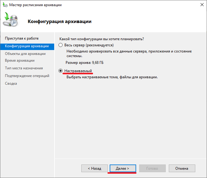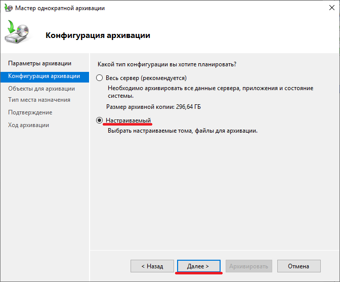 При выборе конфигурации архивации отмечаем настраиваемый диапазон, так как в нашем случае контроллера домена все данные расположены на диске C и архивировать необходимо только его. Нажимаем >>Далее.