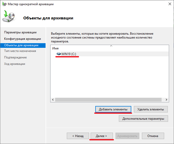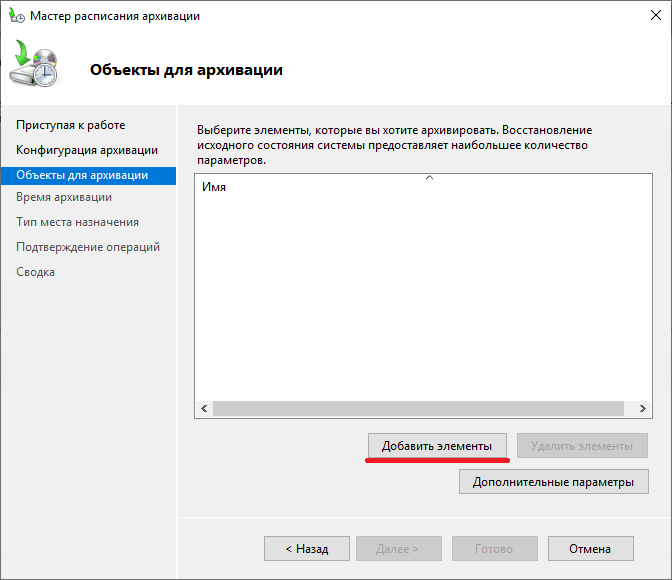В разделе Объекты для архивации нажимаем кнопку «Добавить элементы».