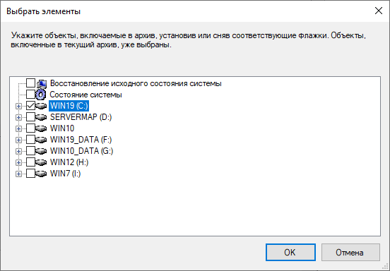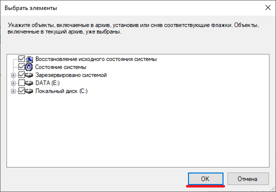 В открывшемся окне выбираем все пункты, кроме диска, на котором планируем хранить архив.