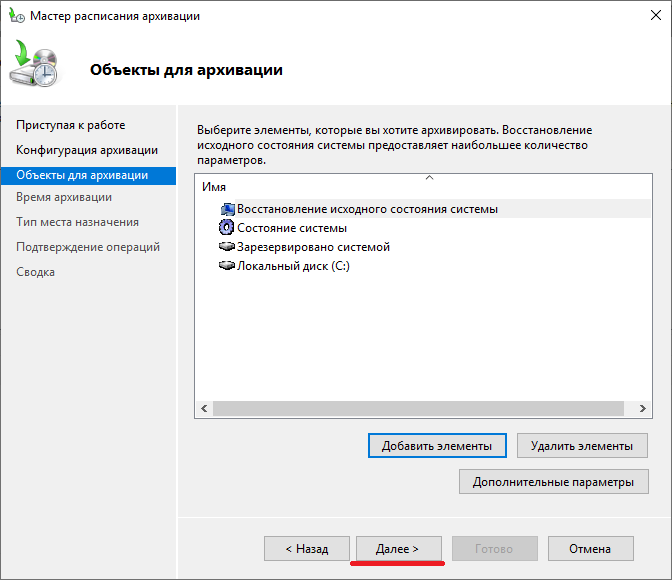 После нажатия кнопки «ОК» можно еще раз убедиться, какие объекты для архивации выбраны. >>Далее.