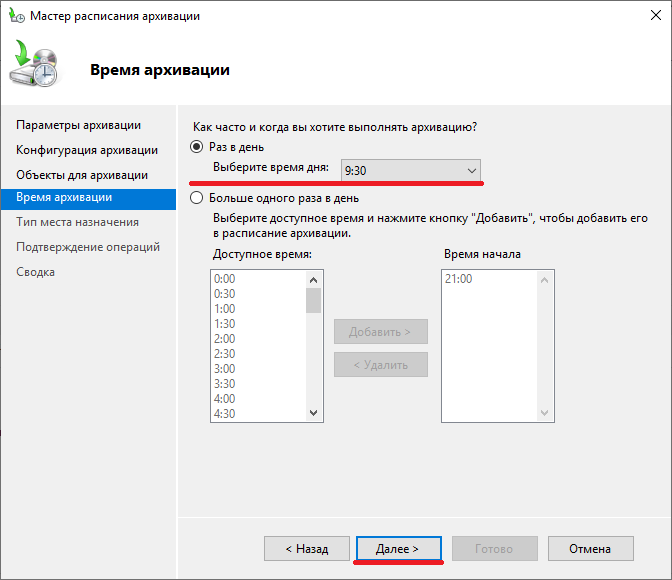 В открывшемся окне в правой части можно выбрать архивацию по расписанию или однократную архивацию. Более надежной будет архивация по расписанию, т.к. резервная копия всегда будет с актуальными данными. Сделаем однократную копию DCSRVER2 и копию по расписанию DCSERVER3.