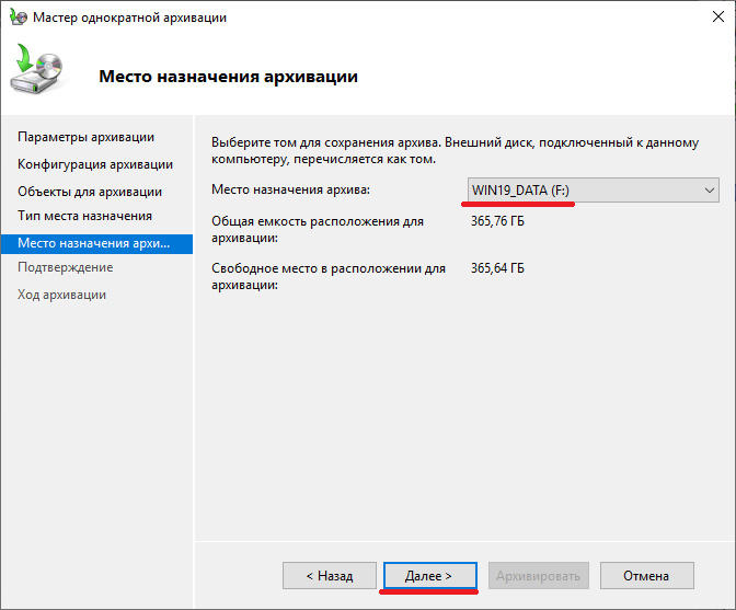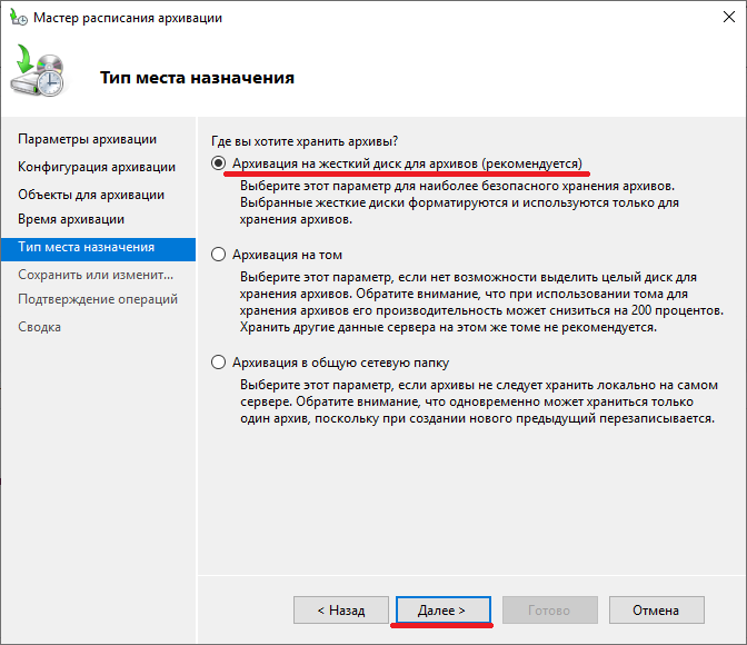 Тип места назначения – Архивация на жесткий диск для архивов. (отдельный жесткий диск) >>Далее.
