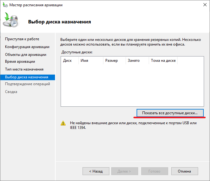 При выполнении архивации в первый раз присутствует пункт – Выбор диска назначения. Нажимаем кнопку «Показать все доступные диски».