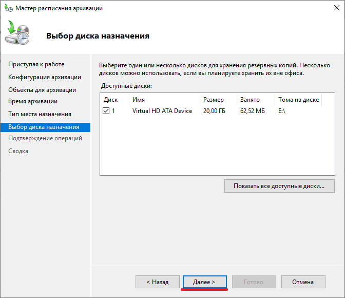 Выбираем в выпадающем списке диск для расположения резервной копии. >>Далее.