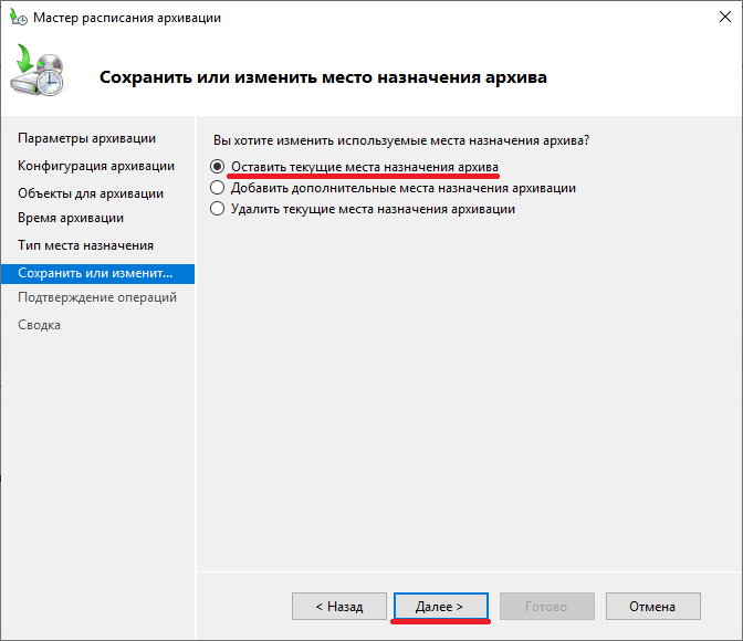 Если архивация выполняется уже не первый раз, и диск для хранения архива выбирался ранее, то пункт «Выбор диска» называется «Сохранить или изменить место назначения архива». Выбираем «Оставить  текущие места назначения архива». Можно изменить или удалить место хранения, отметив точкой другие строки. >>Далее.