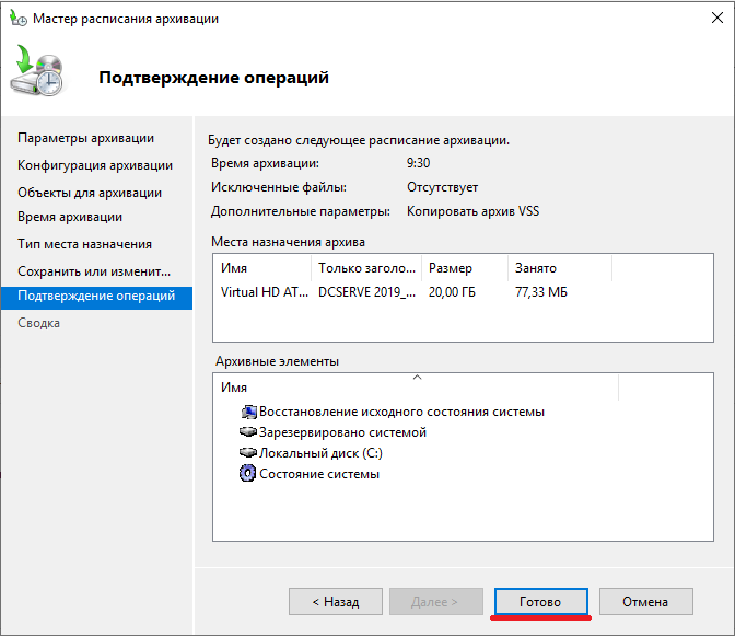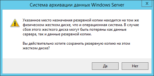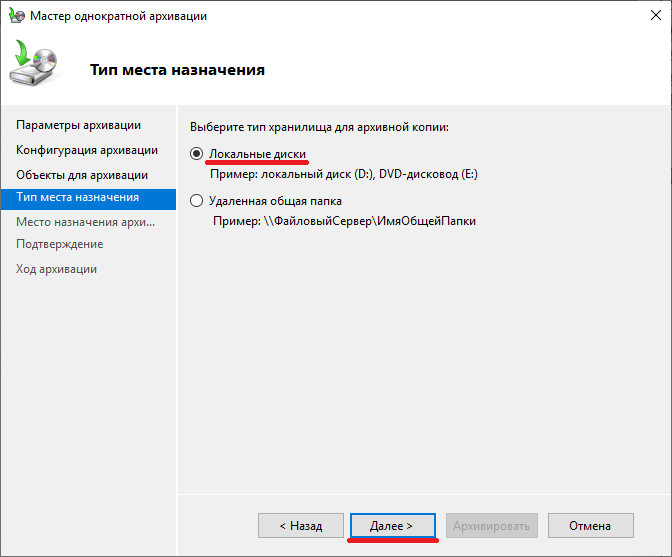 На скриншоте ниже для примера представлена архивация в сетевое расположение. В данном случае необходимо было сделать резервную копию всего сервера МАП, со всеми томами и дисками. Поэтому мне пришлось выбирать место для хранения резервной копии вне сервера.