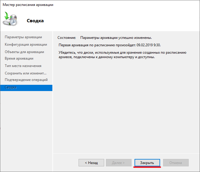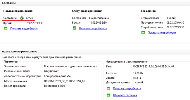 В заданное время архивация выполнилась автоматически, о чем можно посмотреть в основном окне системы архивации.