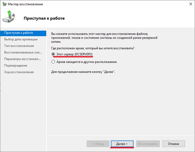 В  первом пункте открывшегося мастера восстановления выбираем место расположения архива. >>Далее.