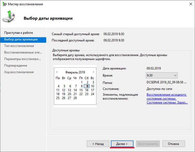 Выбираем дату создания архивной копии. Можно нажать на ссылку «Элементы подлежащие восстановлению» и посмотреть эти элементы. >>Далее.